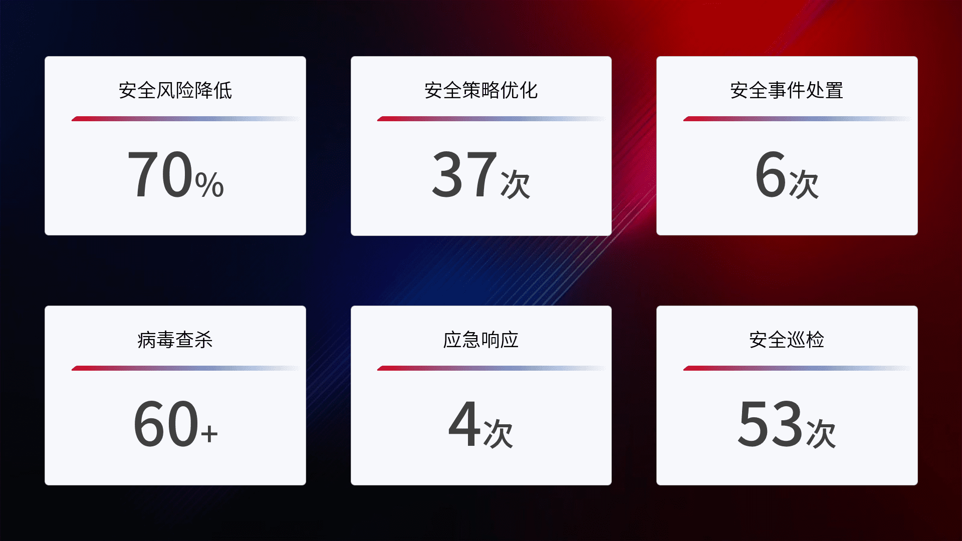 提供全面的安全事件报告体系,,包括处置报告、、、周报、、、季度和年度总结,,,,结合持续监控,,,,帮助客户深入了解网络安全状况。。。。